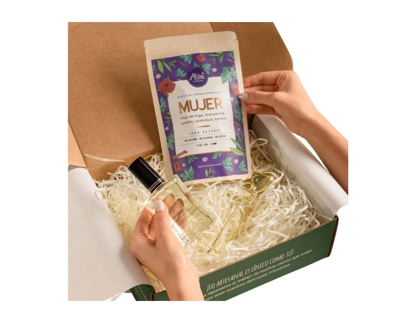 Dentro encontrarás Mujer, nuestro blend de hierbas aromáticas creado para reconectar con tu energía interior; un infusor en forma de corazón para acompañarte en momentos de calma; La Déesse, un aceite corporal de Ananau para nutrir y honrar tu piel; y una guía de rituales de autocuidado pensada para recordarte que también mereces cuidar de ti misma.